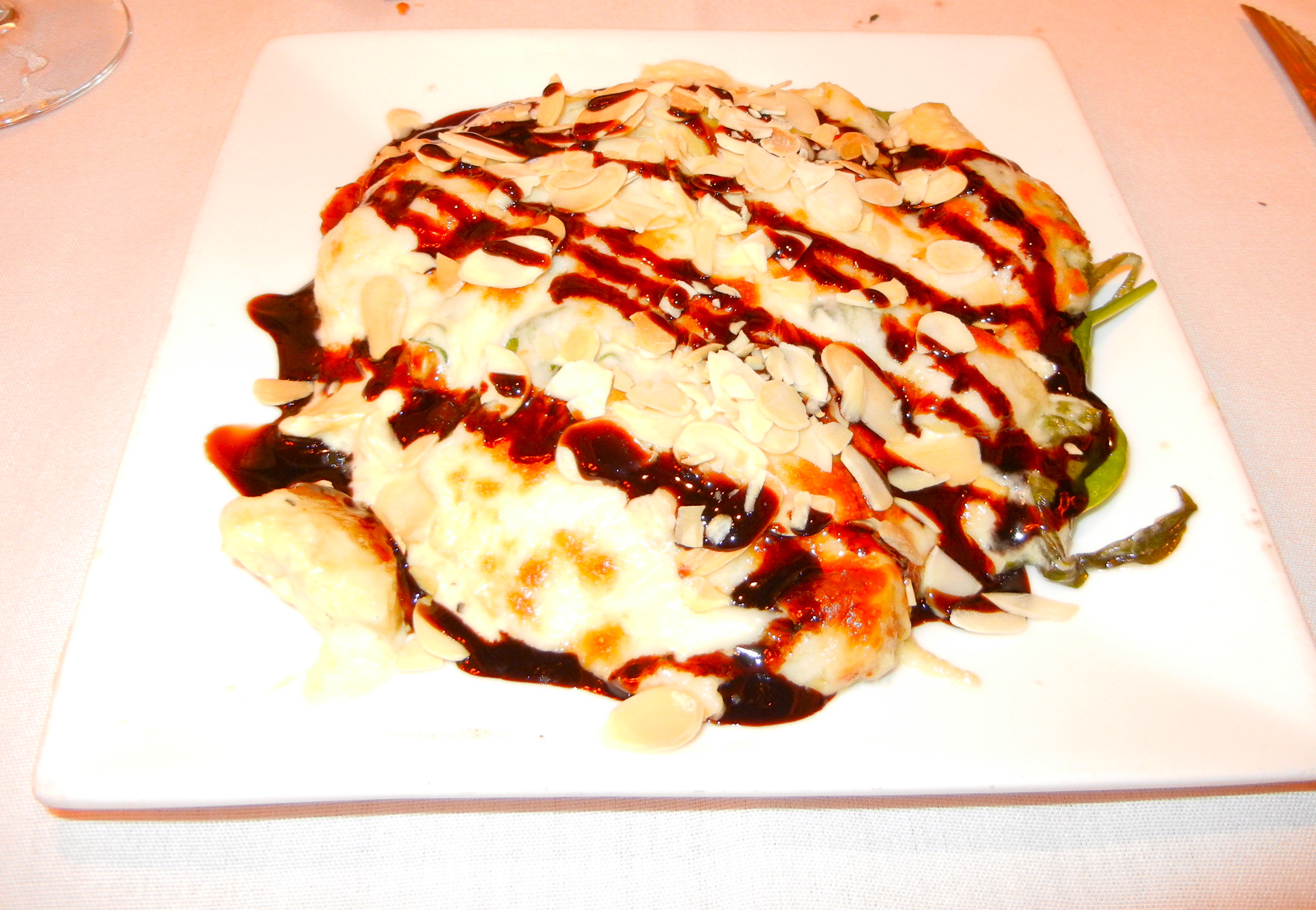They split the order for us, so that’s why we show two plates. The cheese was wonderful in the dish with one piece slightly smoked and the other one plain. For our small plate we order the wood-planked salmon with a side of stuffed portobello mushroom.