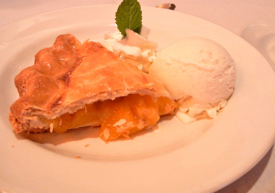 The salmon is cooked to perfection and the mushroom is sinfully stuffed with a cheesy-gooey mixture of spinach and artichokes. Even though we will not ride until Sunday, Mallory gushes so much about the fresh peach pie that we must get a slice.