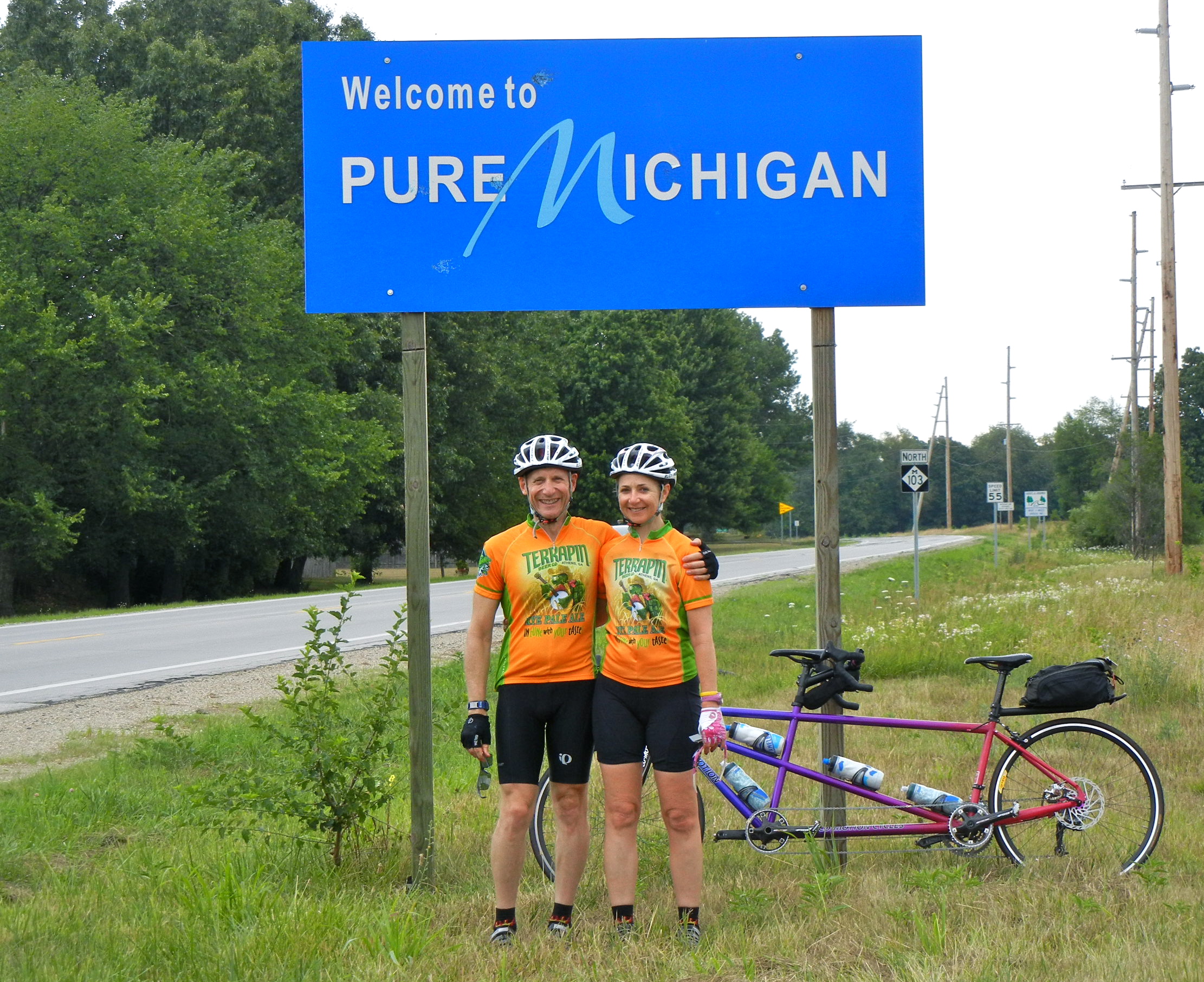 It’s Sunday morning, and everything in this area is closed on Sundays. Everything, but our bike, which we roll out of our tandem hauler and finally get some exercise. We are headed to Michigan, because for some reason we think it’s cool to cross state lines on a bike ride. The terrain is pretty flat in this part of the state, and the few hills that we do encounter are easy ones. We get out of the big chain ring only a couple of times the whole day.