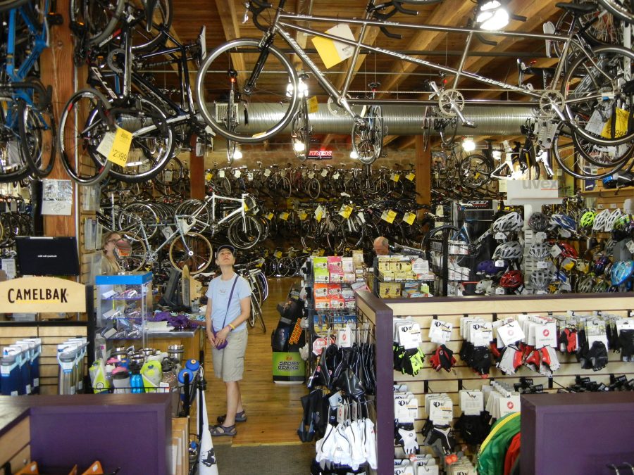 We are in the mood for brats, and the restaurant that we want to visit is not open for lunch. Is that a very large bike store across the street? It is! I have never seen this many road bikes in one store. They have to have at least a million dollars in inventory.