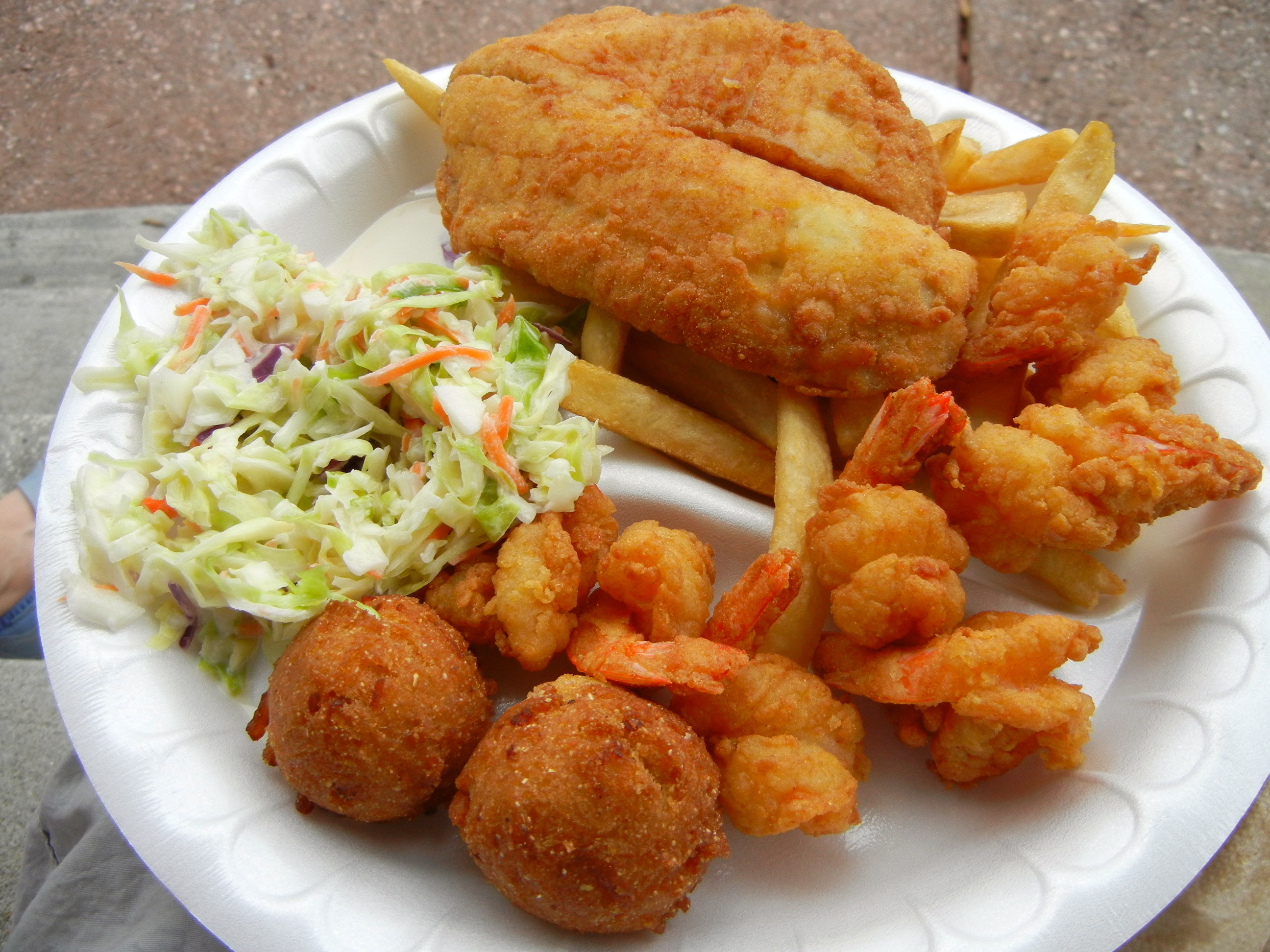 Here’s the end-of-the-road lunch that we pedaled 420 miles for. The best things in life are free, frozen, or fried.