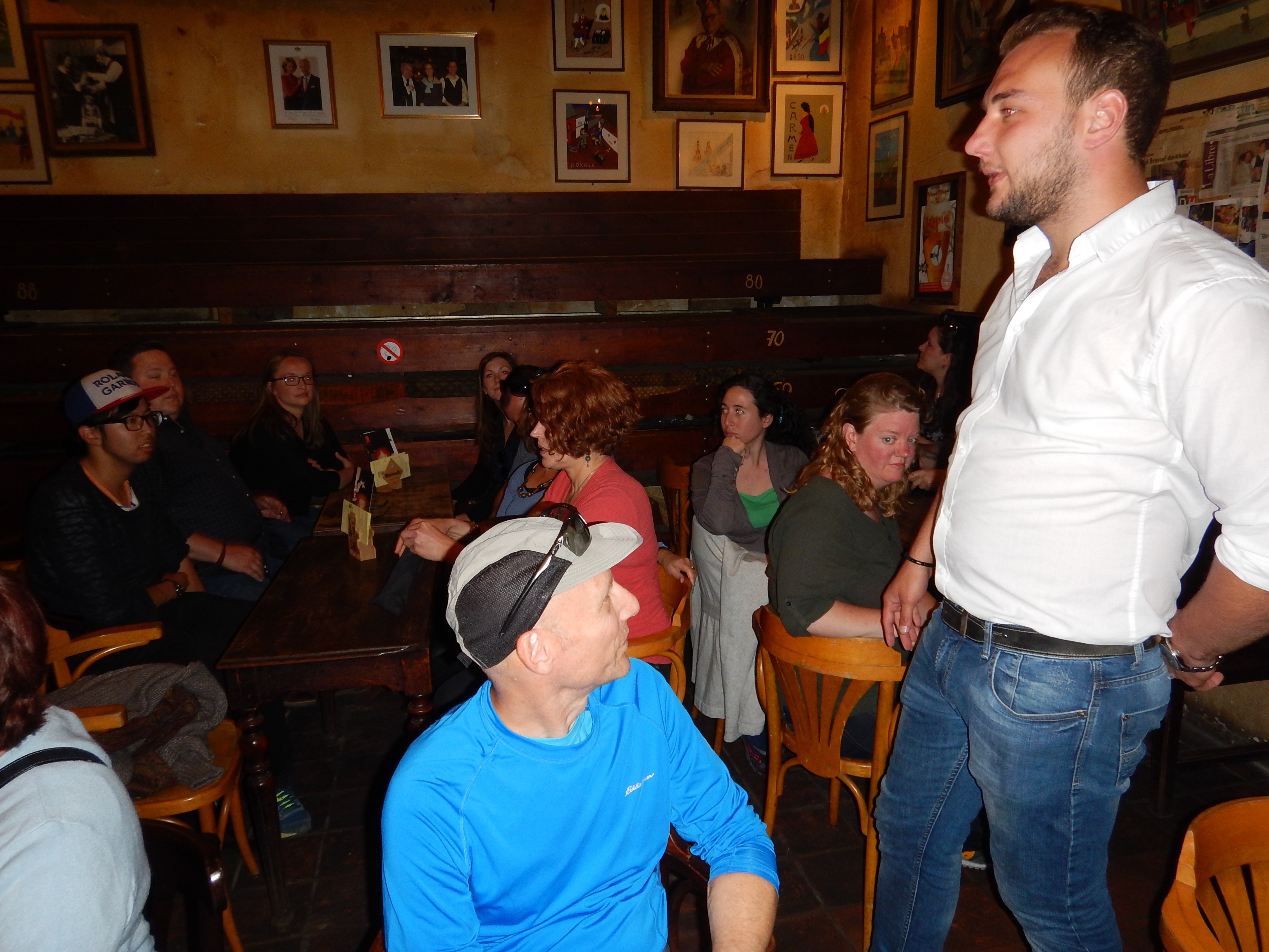 the highlight of our stay is the pub crawl. We meet our big, blonde, brawny, Belgian tour guide in front of the Godiva Chocolate store in the Gran Place at 2pm.