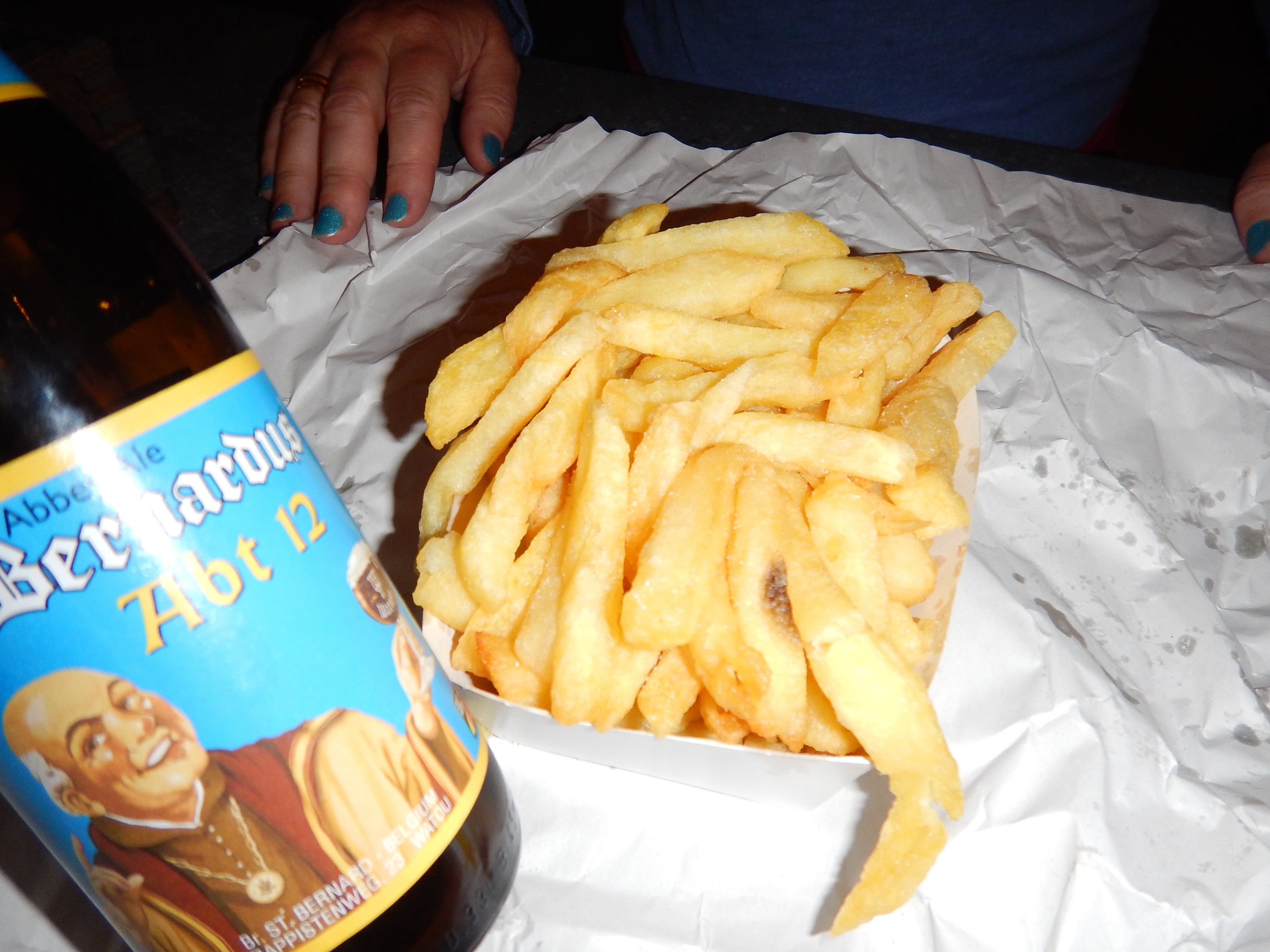 Six of the eleven Trappist breweries are in Belgium. Without going into the history of monasteries who brew and sell beer, lets just say that the Trappists generously give much of their profits to charity, thereby making the buying and drinking of beer seem like an act of doing good. We have never had Orval before – notice the fancy goblet. Belgians always like the glass to match the beer so it tastes just right. Our next stop features 2 tastings – they are not in the correct glassware. We are told it’s difficult to have enough of the smaller tasting size glasses (4-6 ounces) so we forgive. We’ve placed the correct bottles beside for the photos.