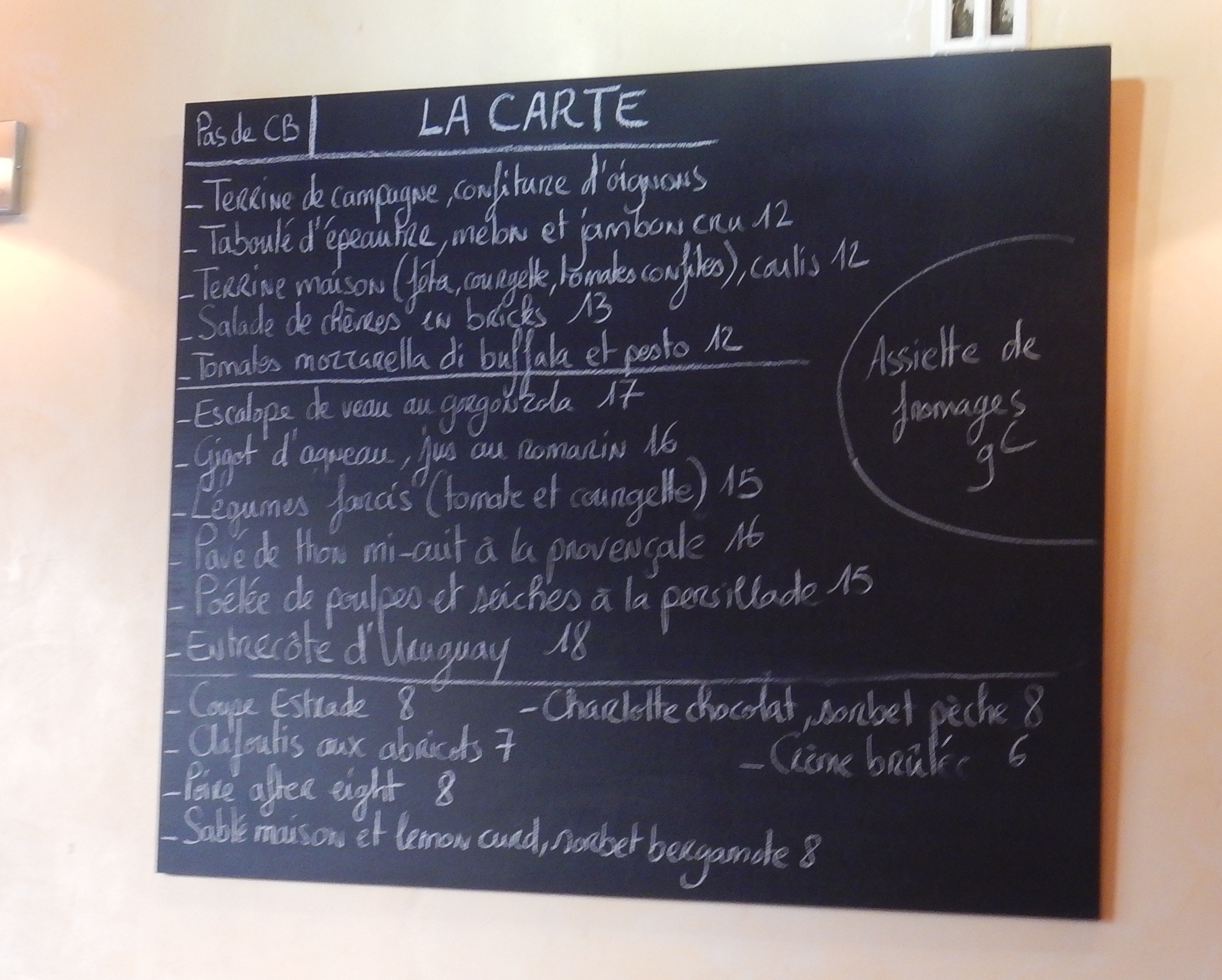 No matter where we go, we like to pause and celebrate the week with a date night. This gives me the opportunity to feature a meal of the week, and it gives you a glimpse of what’s cooking in Provence. This week we are in the small village of Saint-Saturnin-les-Apt, which is just a few miles up the road from where we are staying. One of the highest rated restaurants in this village is L’Estrade, so here we are! We are unable to make a reservation because when we call they are not open, so we take our chances and go early, hoping that we can snag one of their last tables. We are not able to get seating on the patio (which is desirable on this hot night), but we are happy to have a table.