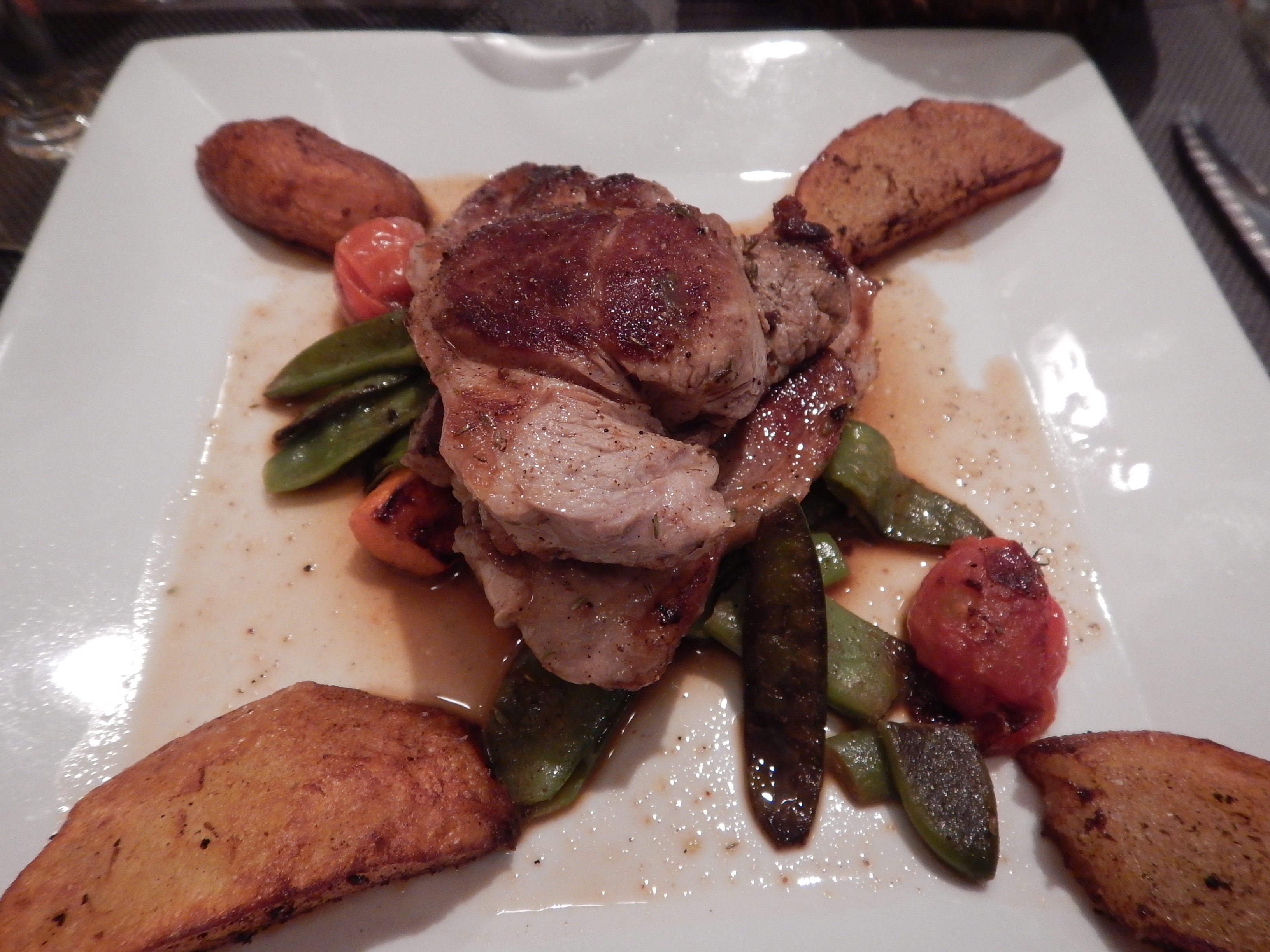 I am feeling adventurous and I order the poelee de poulpes. Our server has a pretty good command of the English language, which is the only reason I order the pan grilled octopus. It also comes on top of veggies and surrounded by chips.