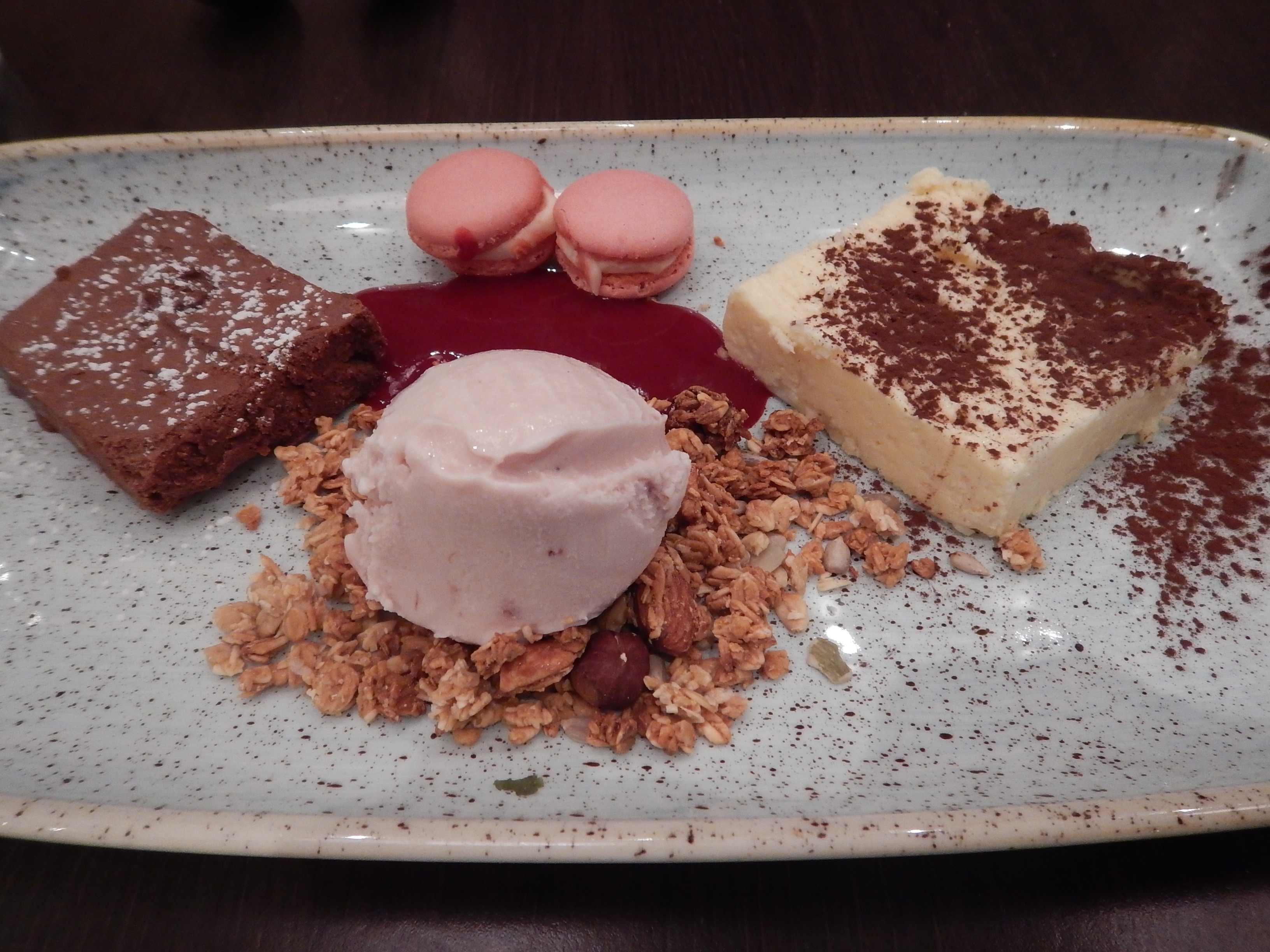 Beautiful rich, creamy white, and dark chocolate mousse, a flavorful gelato, granola and a raspberry sauce with 2 adorable mini-macaroons. Molto Benne!