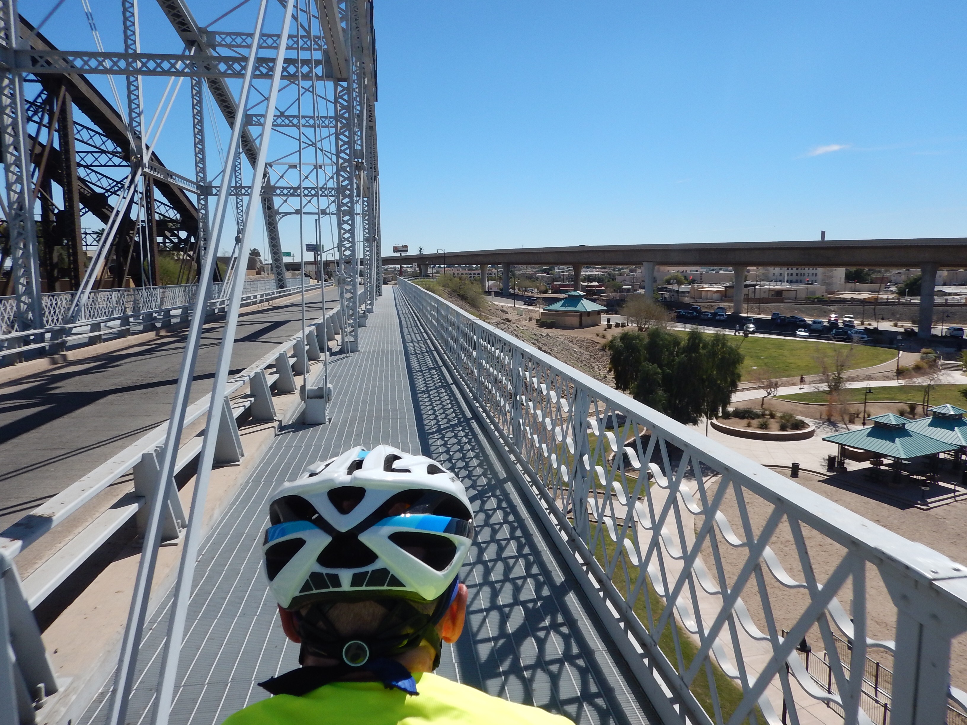 Our arms are burning as we try to keep the bikes upright.  Finally, we approach Yuma and the Ocean to Ocean Highway Bridge, the first auto bridge over the Colorado River.