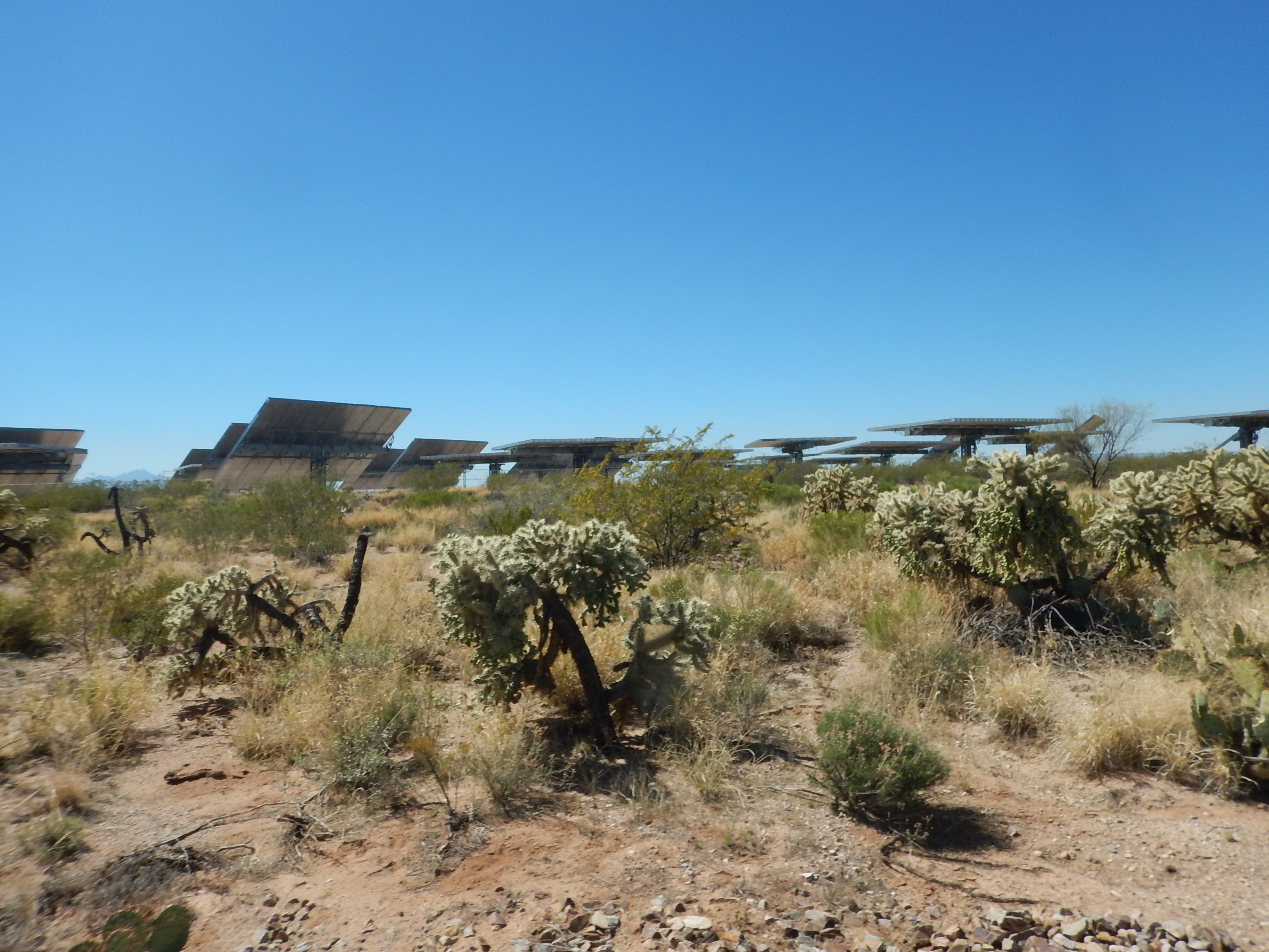 We know we aren’t in the Sonoran desert anymore because here, near Tucson we see prickly pear, a form of cactus trees and the largest solar panels ever.