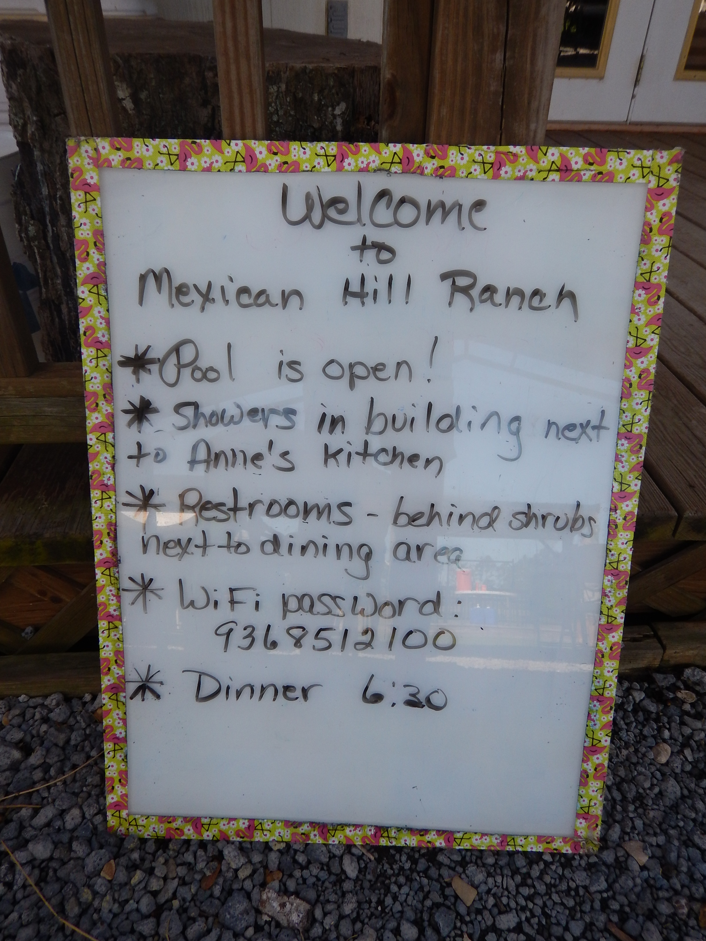A welcome sign greets us with pertinent information for the campsite.