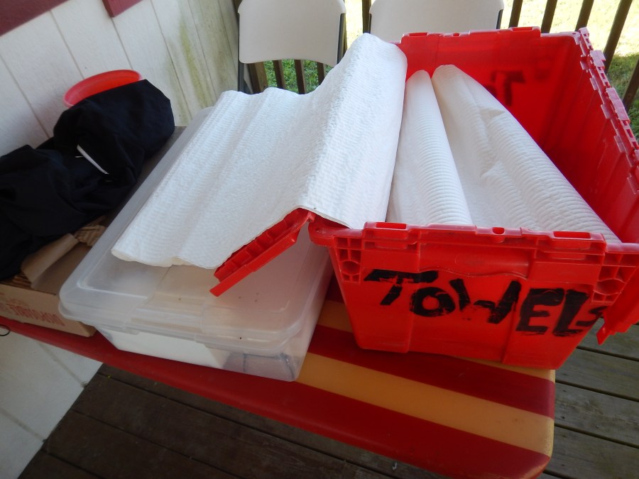 We hope for more than one shower stall. Those in early usually don’t have to wait. We use paper towels and washcloths, then repurpose them as tent floor mats or bike cleaning cloths.