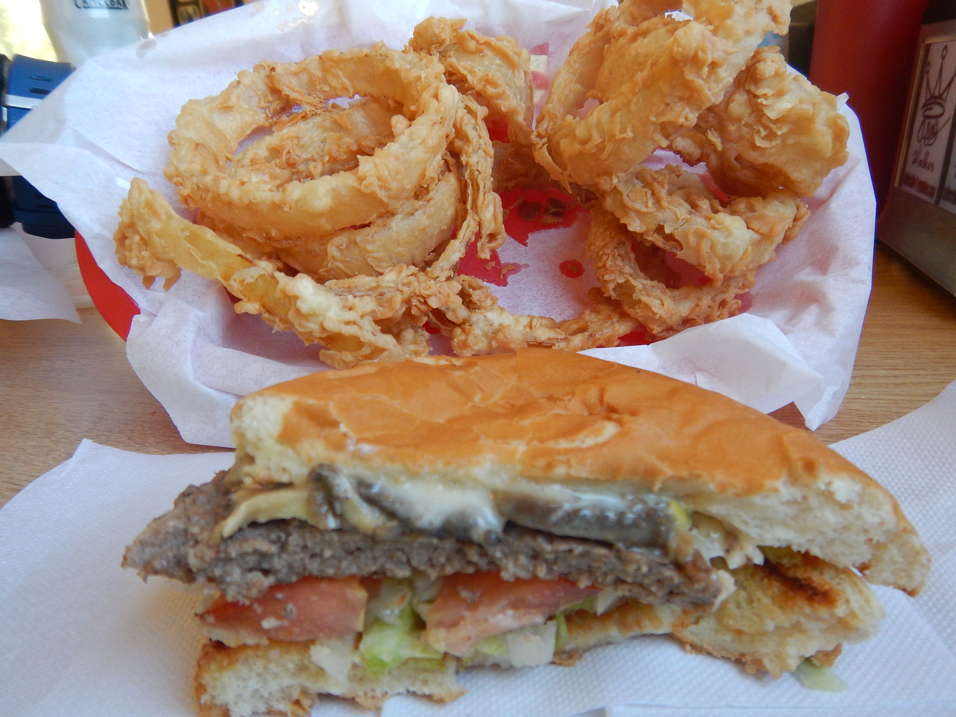 Here’s the mushroom Swiss burger that came with our rings.