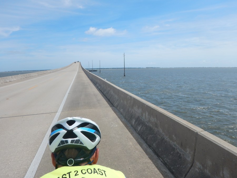 The day concluded with a brisk headwind while climbing this bridge into Dauphin Island.