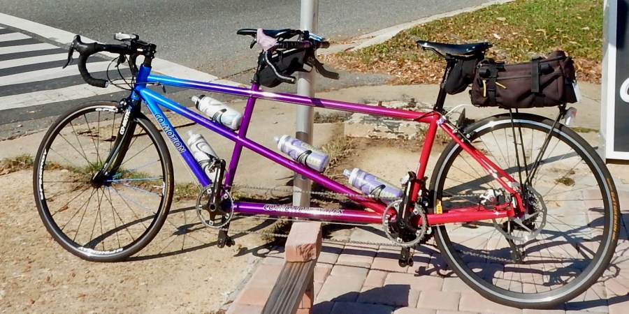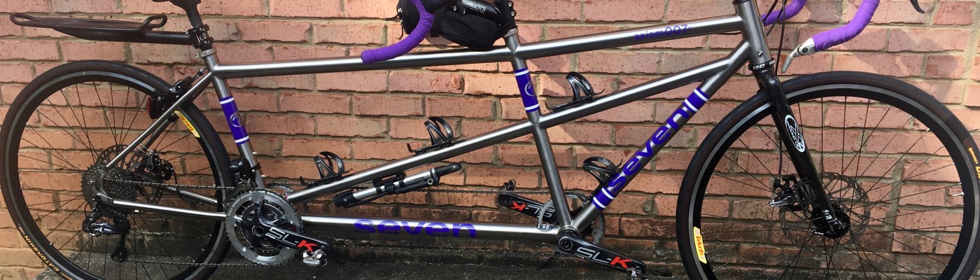 7. This is a beautiful bike! Two couples in our town have Seven Tandems, it is my dream bike. One day one of the couples dropped by our house as we were working outside and my wife chuckled when she saw their bike knowing that I was doing a little coveting in my heart. 🙂 Our unnamed tandem went back to the same builder with a cracked seat stay to which they blamed me, that turned a fan into a detractor. We will never buy another one and are looking forward to the day we purchase a titanium tandem. I think everything but the seat posts will transfer. We have two tandems and our other bike was built by Dennis Bushnell in the same shop as your Erickson if I understand correctly, it is our touring bike and it is still looking great and going strong! Surprisingly it weights the same as the UN-name bike.