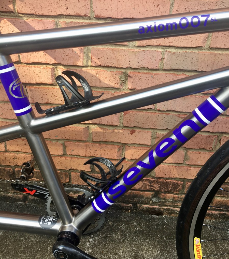 While we were on Coast 2 Coast, the manufacturer of the bike (a leading tandem company in Oregon, who we will not name, but we are pretty sure you can figure out) called and said it could not be saved. We would have to buy a new frame, and they would be happy to sell it to us at “cost”. What about the lifetime guarantee on the frame? Well, that does not cover rust caused by sweat. After some deep thought, we told the leading tandem company in Oregon to “stick it”. What could we buy that is sweat-proof and rust-proof? Carbon? Knowing our luck, we would probably break it. Titanium? Yes, please. Say hello to our new Seven Axiom 007.