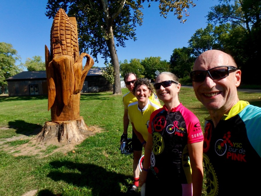 It’s hot on the trail. We can’t start too early because if we do, we will get to the next city way before our hotel rooms are ready. Today’s ride is short, so we find some diversions along the way. This ear of corn is carved from the tree that used to be here.