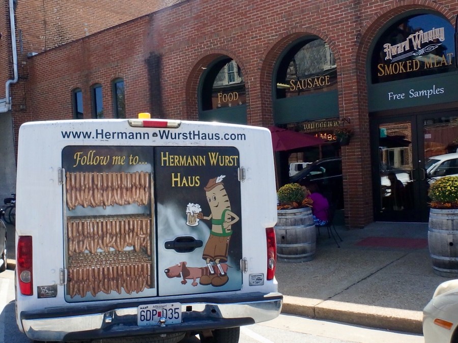 Its bricks were glazed with beer when it was built. A short time later, we are at the “wurst” restaurant in Hermann, the Wurst Haus.