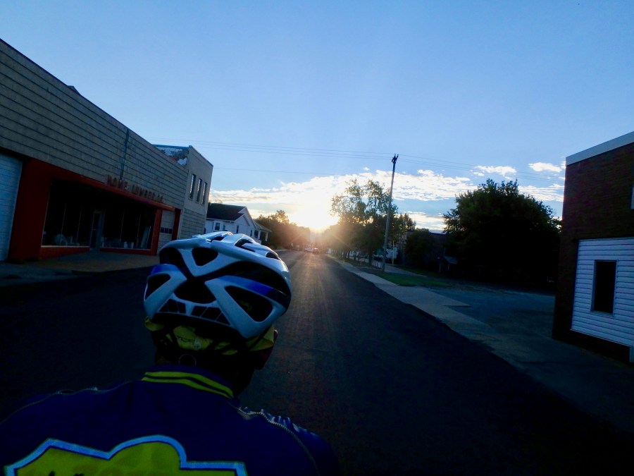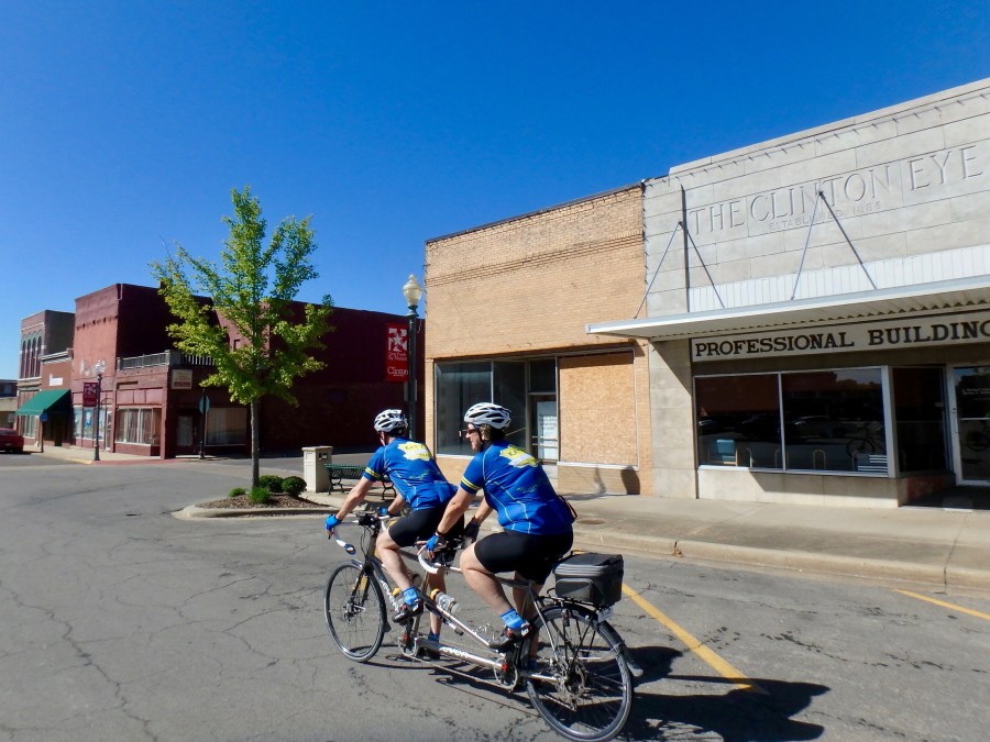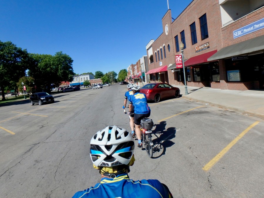 Did we mention the new jerseys? There is a nice tailwind today, and once we hit the high point, we get 15 miles of “downhill”. Before we know it, we zoom into Clinton, the end of the Katy.