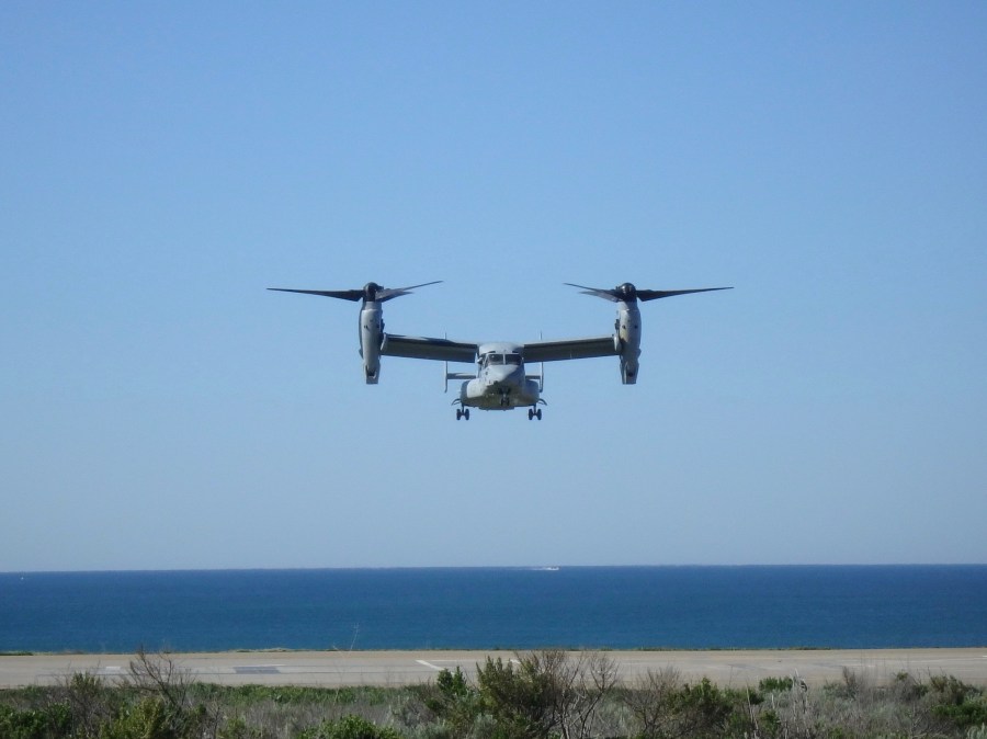 While riding near Camp Pendleton we frequently see training exercises, but we don’t always get such a close up look at the Osprey Helicopters. They land and takeoff like a helicopter buy apparently fly like a plane – now you know!