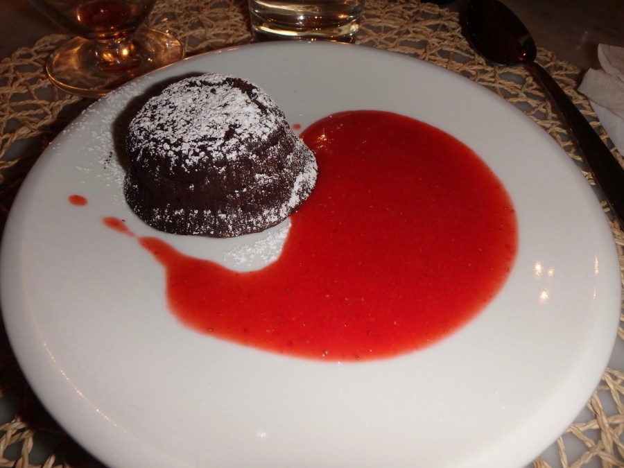 A divine chocolate bomb cake with fresh strawberry sauce – Yum!
