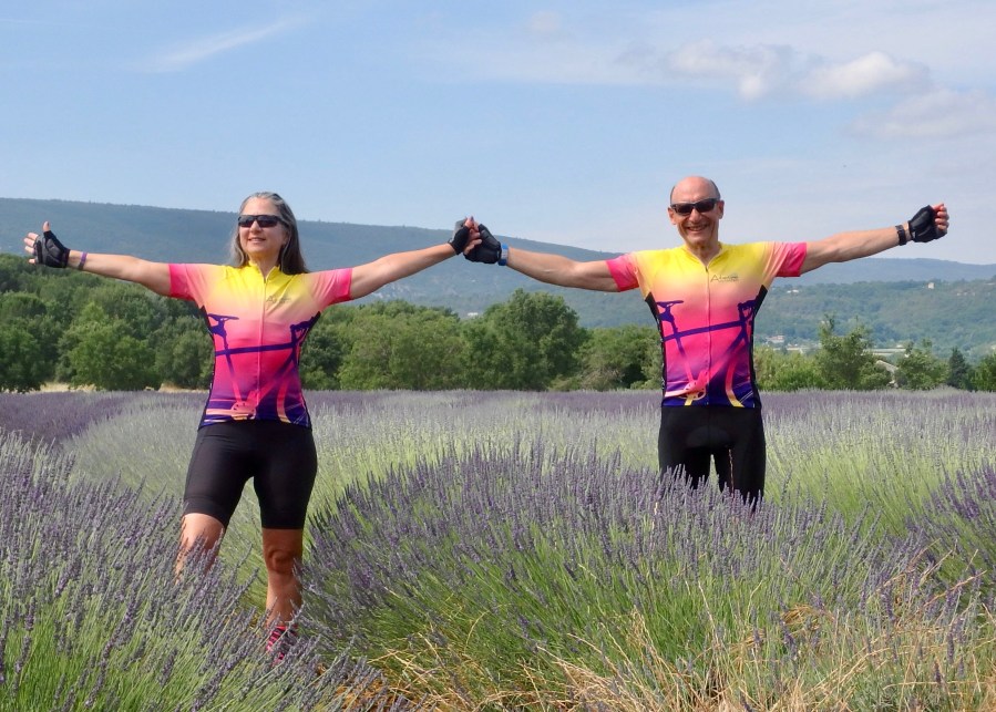 2. My favorite picture is the one in the fields with your arms out. I love those jerseys – the colors with the bike on the front. The people in them make them look even better. So glad you are having so much fun.