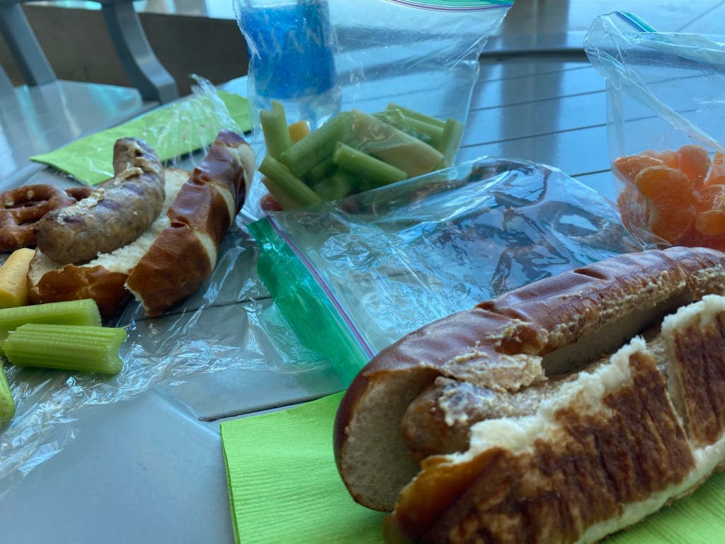 There are a few restaurants open. Not knowing the food status at the airport, we pack some homemade sausage hoagies on pretzel bread along with some various accoutrements.