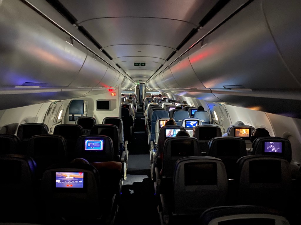 1:10PM: Flight departs on time. Plane is about half full. Middle seat is open on the rows of three. The aisle seat is open on the rows across from us. Still, there is someone sitting a row in front of us, but everyone on the plane is required to wear a mask.