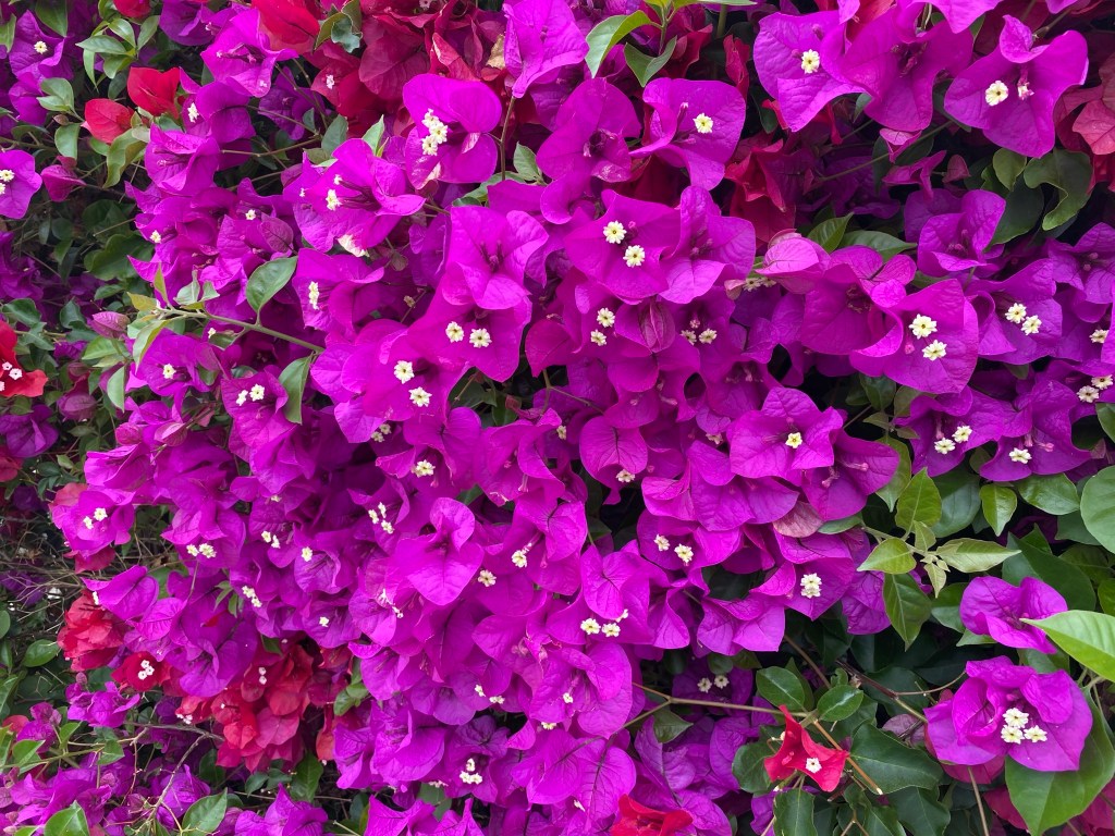 1. Thanks for the bright and cheery mid-afternoon pick me up! The purple flowers with no scent are Bougainvillea. I know purple would be your favorite, but they come in a variety of other colors too and are very easy to grower in warmer climates. We have some pink ones in pots in front of our house. When we had them planted in in the ground at our last house they seemed to grow faster than we could trim them.