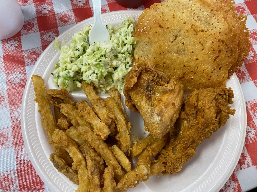 Chicken, twice fried taters, cone (fried corn bread) and coleslaw