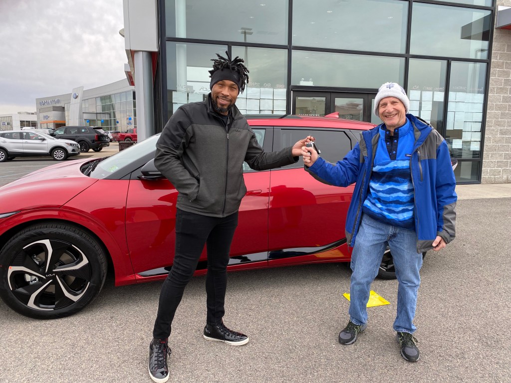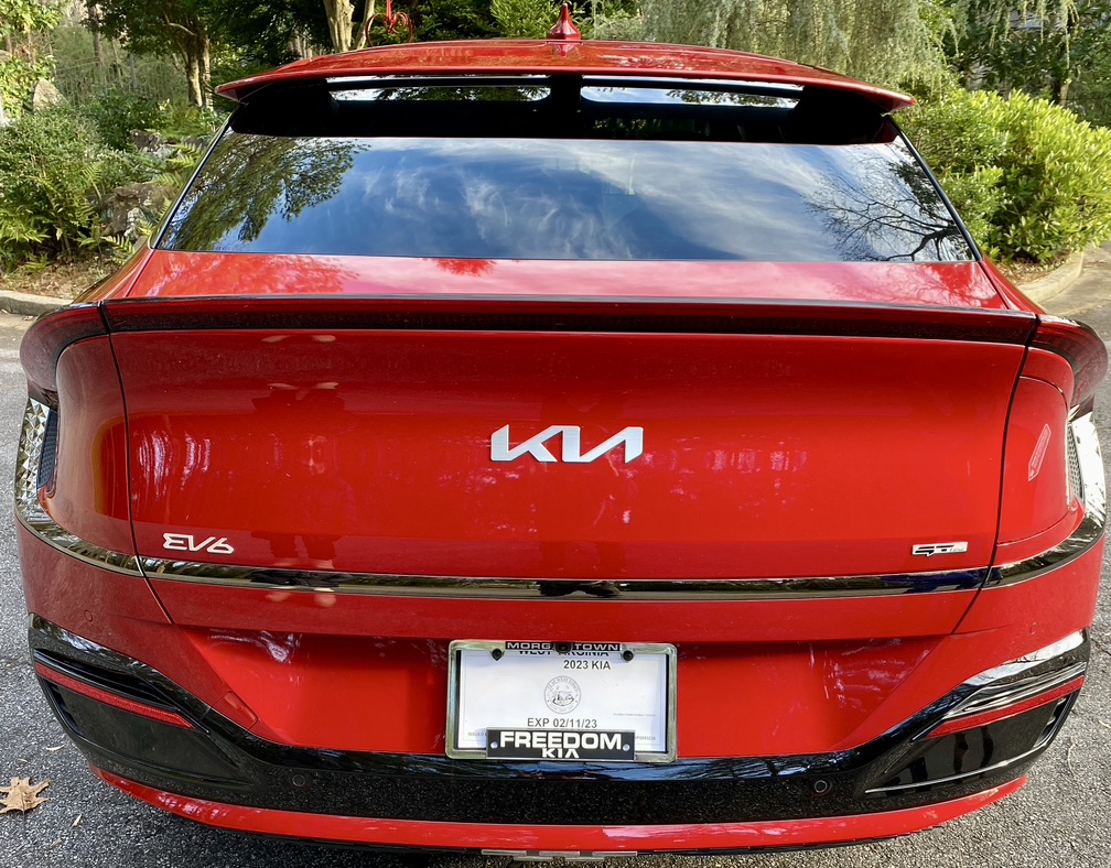 And here it is on the dealer lot, the all-electric 2023 Kia EV6, all-wheel drive with 320 horsepower and 14 miles on it. The car costs more than our first house!