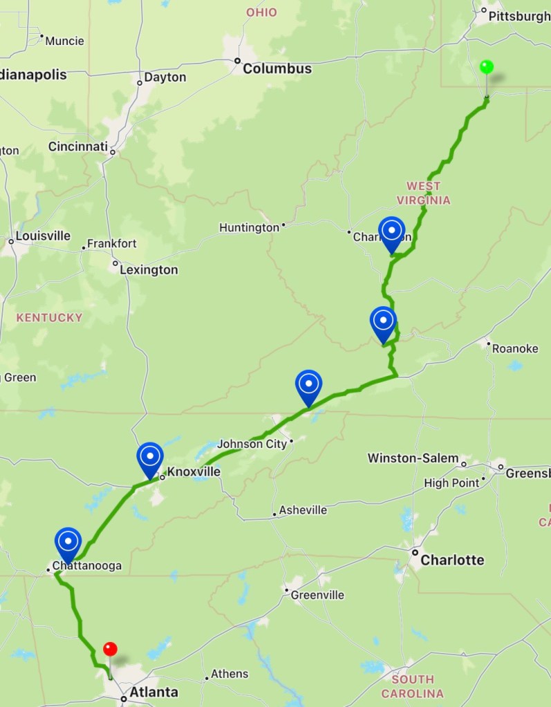 This one took about 15 minutes, which is how long it took us to walk to the Walmart, use the facilities, and get back to the car. We didn’t need to charge again, but after the anxious moments from Day 1, we stop in Ooltewah, TN (just outside of Chattanooga) for 10 minutes to “top off the tank”. Did you know that Ooltewah is the home of Little Debbie snack cakes? Check out the company store if you are in the vicinity. We did.