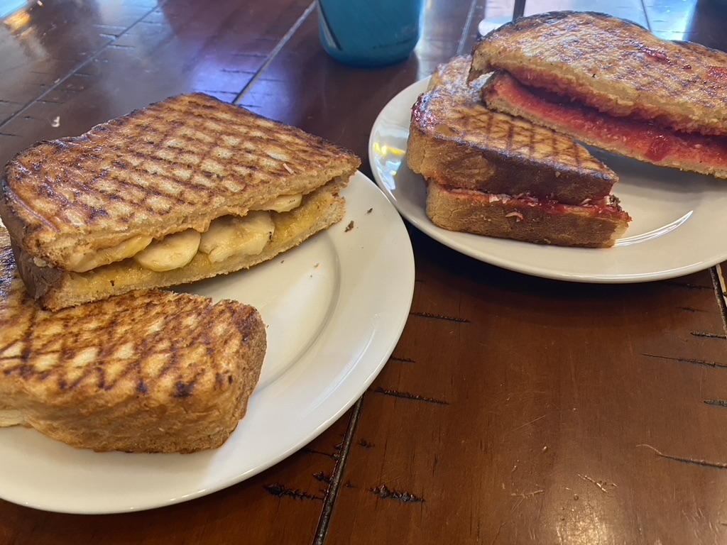 Our grilled (yes, grilled!) peanut butter and jelly lunch was not happy in our tummies.