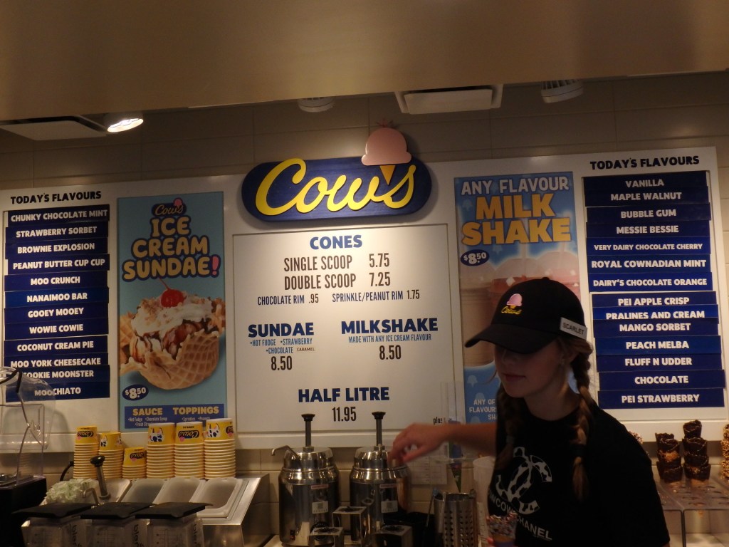Some of you may remember us eating ice cream on a rainy, cold day on our PEI tour. It was at COWS which is famous in Canada. They have a branch in Banff with a constant line and at least a 30 minute wait! Worth it!