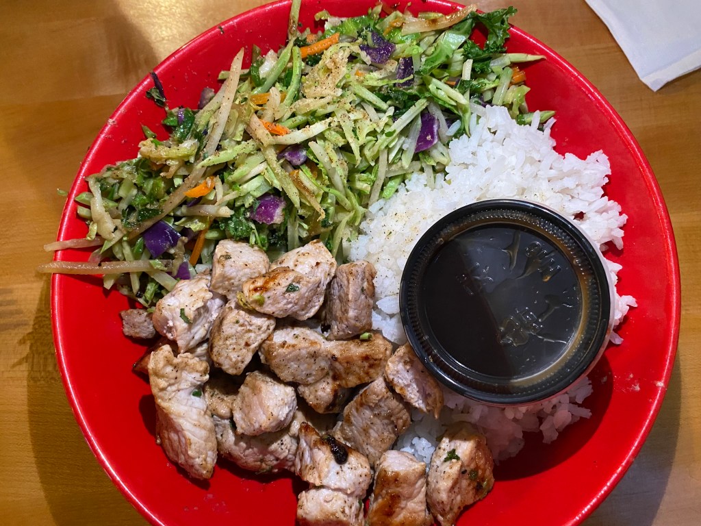This is called the “Buff Bowl” with pork – it’s sold as a healthy option 🤷‍♀️!