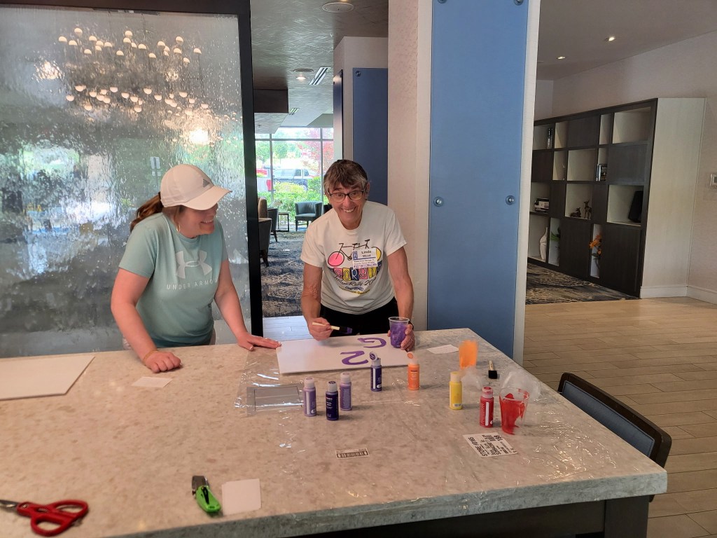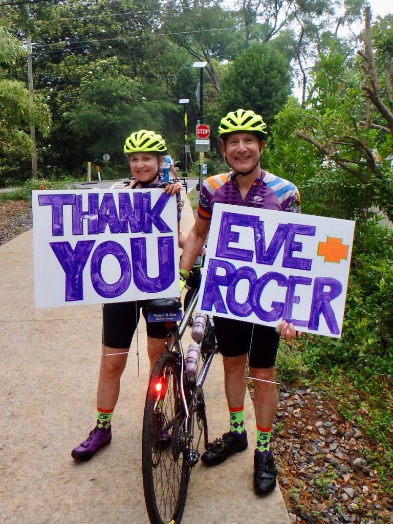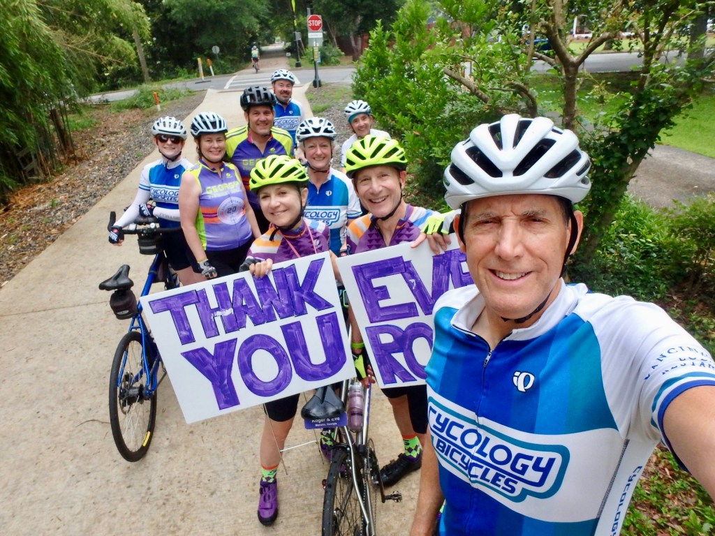 The “ring leaders” of the secret project are seen above – Audrey, Christen, Ryan, Eric and Linda! Thanks for your thoughtfulness. Below are the final signs which we made into a group photo op…and then the skies opened up and soaked us for the last few miles of the last ride. It was okay because it covered our tears.