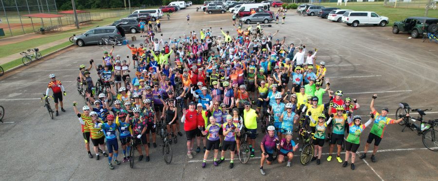 After everyone got ready to ride, we had to “herd the cats” to get the ultimate drone photo of almost 100 tandem teams. Then Roger had his rider meeting and we were off!