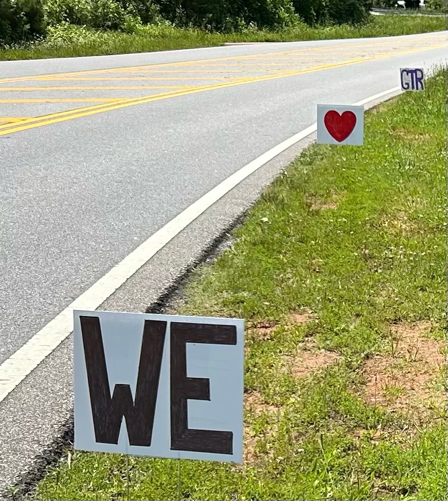 The surprise truly touched us because a committee of those who were at the first GTR (and many more) coordinated the creation of signs to line the route of the Cricket Frog Trail. The signs professed love and thanks for all the years of GTR and for Roger and me.