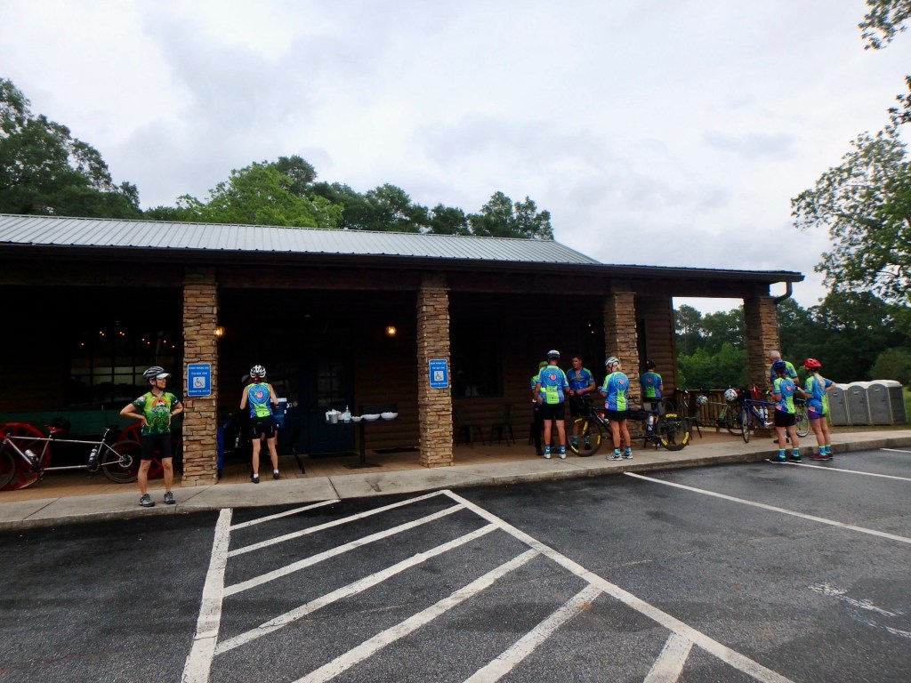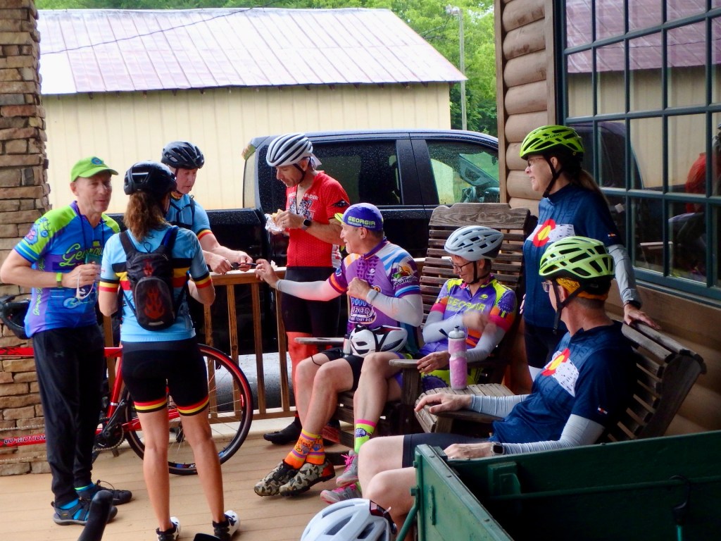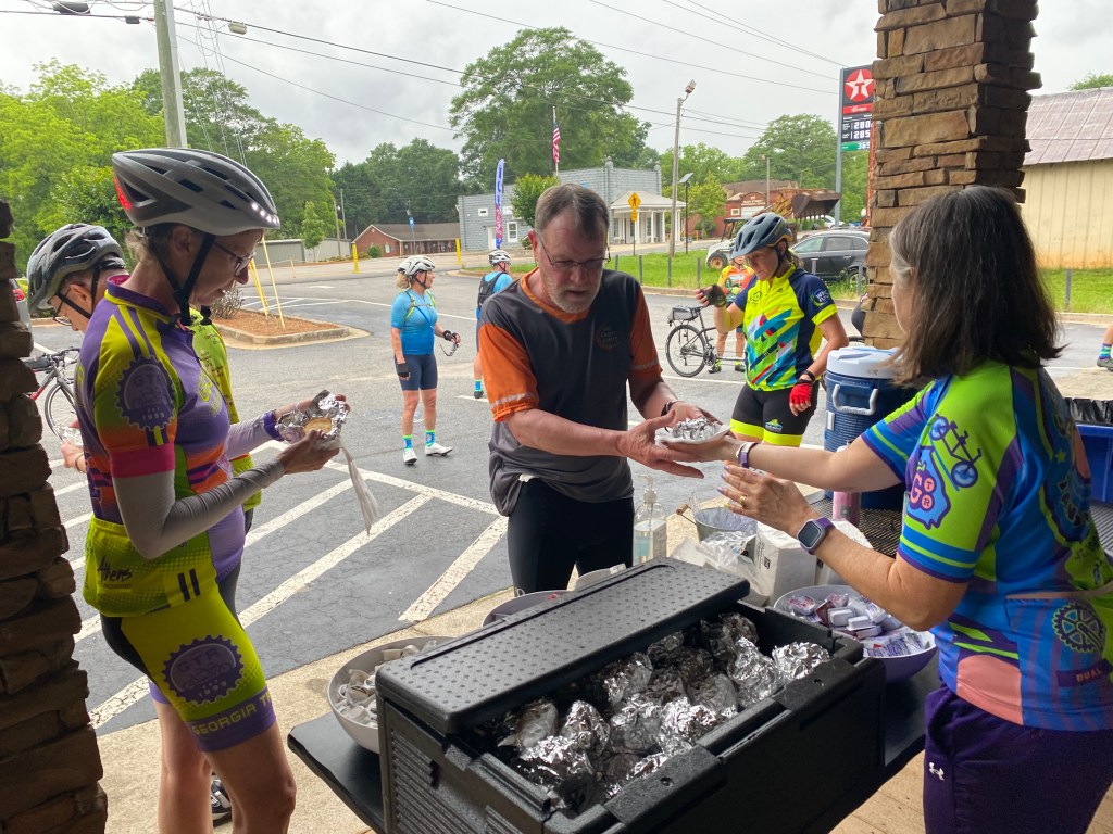 There were also a few teams (above) who stayed totally dry, and came to have hot biscuits. Usually the Saturday photos are of people getting ready to ride and all decked out in their GTR jerseys, alas – today we had to settle for the biscuit stop. There were many leftover and they were brought back and enjoyed at the hotel during the afternoon.
