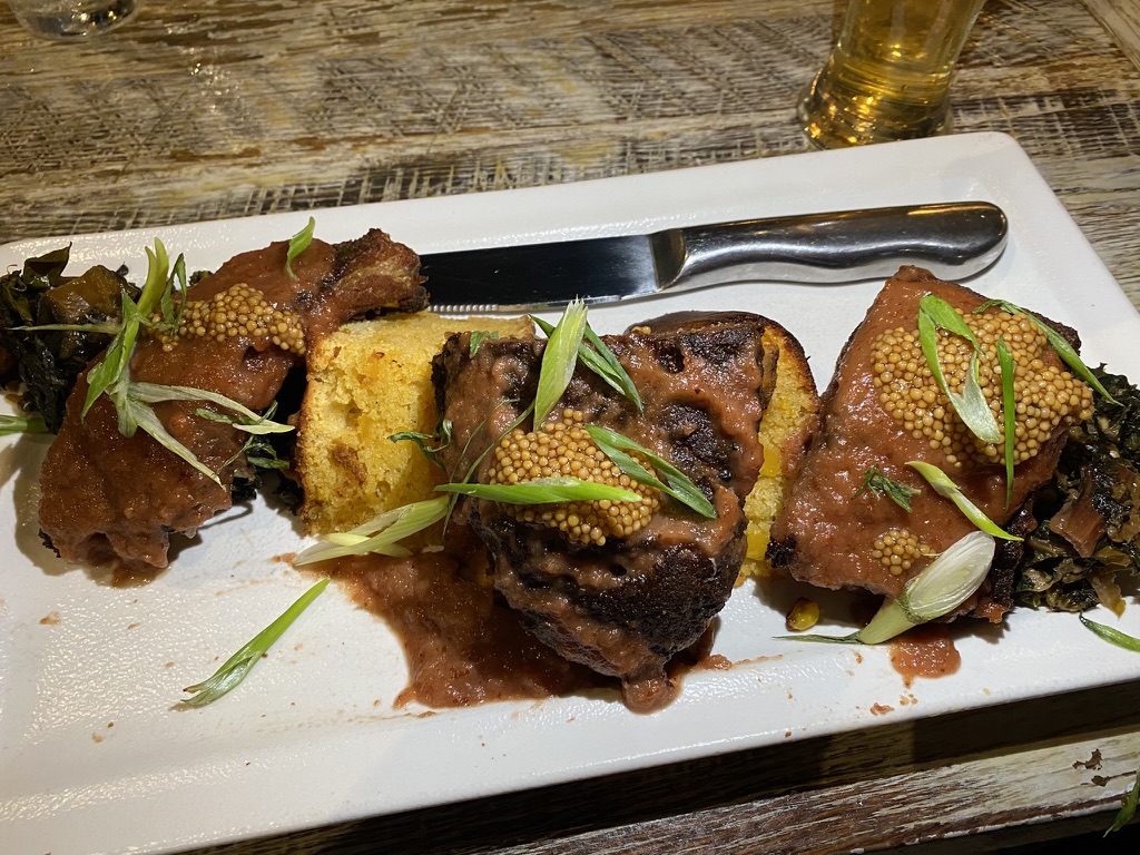 Dinner featured sticky ribs with cornbread and a huge piece of fried chicken with a quinoa salad. The ribs dish was gorgeous, but I think we are drawing the line on ordering ribs north of the Mason-Dixon line. Two ribs were perfect, but the rest were dry. That fried chicken breast was very impressive, though.